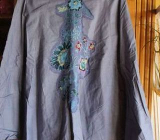 TUNIQUE FEMME COULEUR PRUNE DESSINS NOIRS TAILLE 34/36 PETITES MANCHES ENCOLURE RONDE EMPIECEMENT POITRINE ENTIEREMENT DOUBLE CEINTURE NON AMOVIBLE HAUTEUR EMPIECEMENT 30 CM L