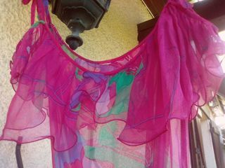 Robe mousseline de soie pour cocktail ou mariage Taille 38 fines bretelles réglables fermeture éclair sous aisselle resserrée à la taille volants sur le décolleté.