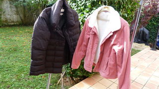 11) Blouson court femme matelassé noir très bon état Taille XL prix : 10 euros 9) Blouson velours rose et fourrure intérieure blanche jamais porté Taille 44 prix 12 euros P