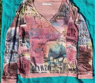 Tee shirt manches longues Multicolores avec dessins Jacqueline Riu 100 % polyamide Taille 4 (mais taille plus petit) 8 euros + port si envoi (possibilité de le déposer sur Ami