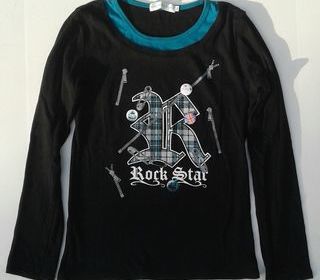 t-shirt longues manches noir avec col bleu motif devant avec 2 pins et une épingle 100 % coton taille 2 4 euros + port si envoi (possibilité de le déposer sur Amiens ou Ab
