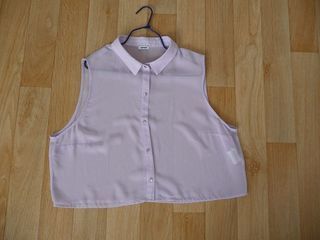 Joli chemisier sans manche, couleur parme, marque PIMKIE, taille L, fermé par des boutons plats en métal argenté (avec bouton de rechange cousu sur l'étiquette intérieure). Longueu