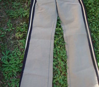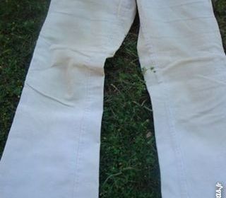 Pantalon en velours mille raies,de couleur beige clair,taille basse,style jean,revers aux bas des jambes.taille 38.Composition:98% coton et 2% élasthanne.En bon état Nous contact