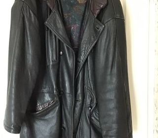 1 veste longueur 0.95 voire en cuir 2 poches intérieur,4 poches extérieur donc 2 avec fermeture éclair, 4 boutons(50.e 1 veste moire et blanche en laine 2 poches 2 boutons lon