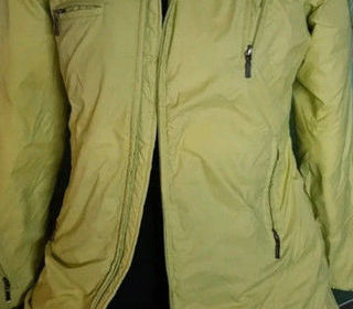 Manteau Doudoune longueur 94 cm vert jaune golden En duvet de canard et plumettes Capuche intégrée dans le col Plusieurs poches Taille S portée par un mannequin taille un grand