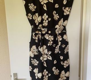 Taille 38 longueur 96 cm tissu 100% coton , très facile à repasser Ceinture assortie avec un bouton Boutonnage et décolleté dans le dos très bon état , toutefois je sig