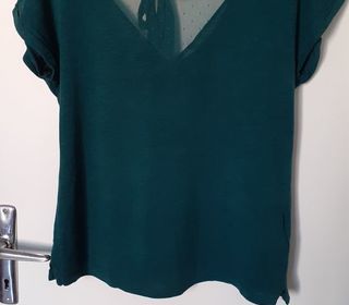 Vends un top 50 % coton, 50 % viscose, petites fentes sur les côtés, empiècement dentelle au niveau de l'encolure, liens à nouer dans le dos, couleur vert foncé uni, marque Cache