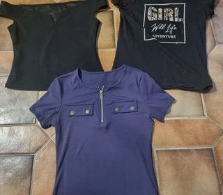 Bonjour, nous mettons en vente ce lot de 2 T-Shirt noir et 1 bleu pour femme taille M vendu d'occasion. État : Bon. ??N'hésitez pas consulter notre profil car nous y avons publié