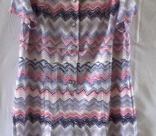 Robe imprimée sans manches, bleue, rose et blanche. Jersey couture Marcelle Griffon. Made in France. Diolen Loft Ouverture sur le devant avec 4 boutons tissus décor robe et