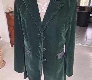 Une coupe impeccable et un velours luxueux et une élégance intemporelle pour cette veste en velours vert foncé. Fermeture à trois boutons dessine une silhouette épurée et structur