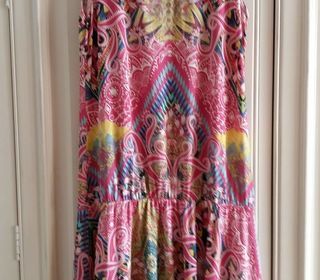 Jolie robe d'été ,très facile d'entretien. Très peu portée. Des couleurs très gai .ton rose, jaune ,et autres. Découpes sur l'encolure sur le devant.