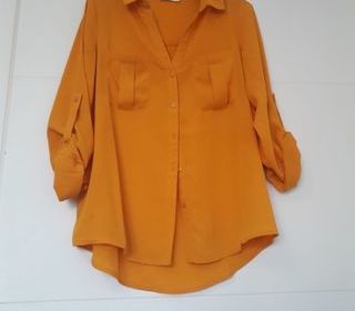 Chemise moutarde Cache -Cache ,manche relevable par patte boutonnée,très bon état.