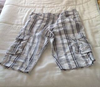 Bermuda taille 176cm, pour adolescents ou jeune adulte. Blanc quadrillé de noir et gris. Occasion correcte. 2 poches devant, 2 poches à soufflet sur les jambes, 2 poches arrières.