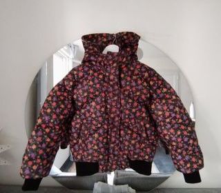 Doudoune chaude à grande capuche, hiver, fleurie The Kooples taille 1 / S (Small) / 36. Chaude et confortable. Excellent état. Couleurs : noir, violet, rouge et orange. Magnif