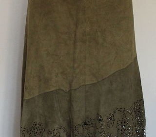 Jupe veau velours kaki ROBERTO CAVALLI T.S taille effective 36/38 Fr cuir veau velours découpe laser - bas asymétrique H 80 cm d'un coté, 100 cm de l'autre tour de taille 74 c