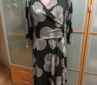 Imprimé rosaces blanches, fond noir, polyester, poitrine en V, croisée. Longueur 100 cm, sous-aisselles 50 cm, taille 40 cm, hanches 60 cm, manches 48 cm - extensible. Transactio