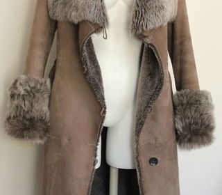 Manteau Shearling ARMANI T.40 Fr cuir, peau, fourrure extérieur beige, intérieur fourrure mouton taupe H 105 cm Aiss 48 cm 2 poches extérieures fermeture boutons TBE (patine