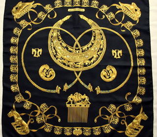 HERMES Les Cavaliers D'Or par Vladimir Rybaltchenko fond noir, motif or, blanc et bleu 90 cm x 88 cm TBE Envoi possible RMP métro Corentin Celton
