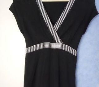 Tunique manches courtes avec lien de serrage derrière, taille 36. Marque originale PHILDAR. Tunique noire avec rayures noires et blanches. 95% Viscose, 5% élasthanne. Lavage à 30°,