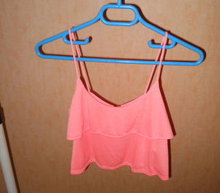 Top court saumon, orangé, taille S/36 neuf. Marque originale PULL & BEAR. 100% polyester. Lavage à 30°, repassage léger. Visible à RENNES ou envoi possible à vos frais.