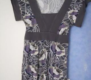 Tunique grise, violine, manches courtes avec lien de serrage derrière, taille 36. Marque originale PROMOD. 94% Viscose, 6% Elasthanne. Lavage à 30°, repassage léger. Occasion en pa