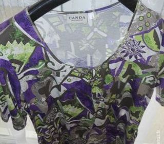 Tee shirt imprimé avec lien dans le dos, manches courtes, taille S, marque originale "CANDA" collection C&A, 95% viscose, 5% élasthanne, lavage à 40°, repassage léger. Jamais porté
