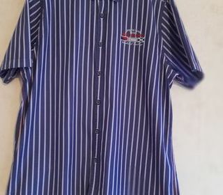 Chemisette, de la marque originale Ollygan, fond marine à rayures bleu clair, blanches et rouges, jolie broderie sur la poitrine, intérieur du col à motifs avec liseré rouge,