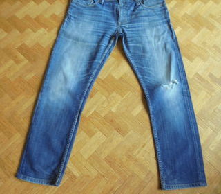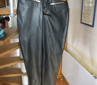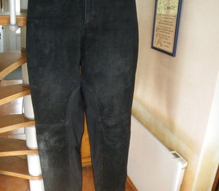 Pantalon en Dain Noir et Tissus. Tour de taille : 68cm, fermeture éclair de : 14cm, fermeture à la taille par 1 bouton pression, 2 poches en tissus de doublure en intérieur du pan
