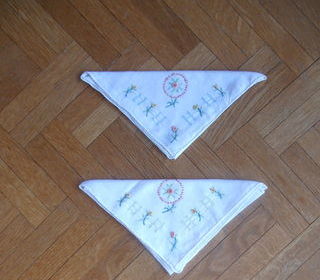 Très jolis mouchoirs blancs, belles broderies aux 4 coins + jours, en 100 % voile de coton, dimensions : 27 cm x 27 cm. Excellent état car jamais utilisé. A récupérer sur