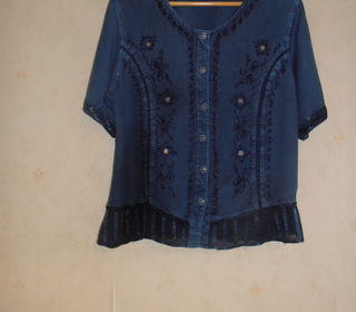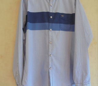 Très jolie chemise, de la marque originale Ollygan, dans les tons de bleus, motif principal de tout petits carreaux, 2 bandes unies dans 2 tons de bleus sur la poitrine, poche