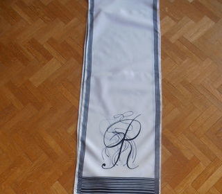 Echarpe fond écru, agrémentée aux extrémités de lettres entrelacées noires, toutes les bordures sont agrémentées de rayures noires, très chic, dimensions : 145 cm x 26 cm. E