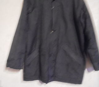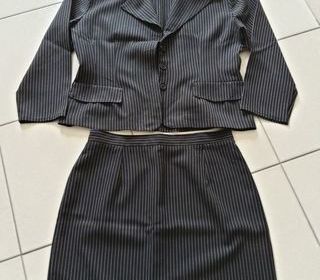 ENSEMBLE VESTE ET JUPE NOIR A FINES RAYURES. LA JUPE MESURE 50 CENTIMETRES ENVIRON. SUR LA VESTE 2 FAUSSES POCHES. FERMETURE A BOUTONS.