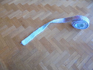 Ceinture réversible, motifs en tissu fleuri d'un côté, éponge unie verte de l'autre côté, 4 surpiqûres, dimensions : largeur 3,5 cm x longueur 160 cm. Excellent état. A r