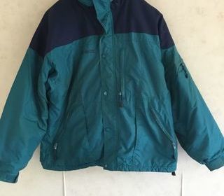 Veste de la marque originale Columbia Sportswear Company, De couleur verte avec empiècement marine aux épaules, Col montant, 2 poches en biais plus une poche poitrine fermées pa