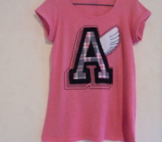 Tee-shirt, de la marque originale Undiz, de couleur orange, col rond, manches courtes avec petits revers, avec un grand "A" sur le devant et différentes matières de tissus, e