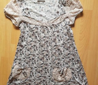 Très jolie tunique en 100 % coton à petites fleurs marron sur fond beige Marque Promod Etat neuf (portée 1 fois) Empiècements dentelle beige au niveau de l'encolure et des poche