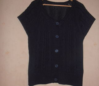 Gilet bleu, de la marque originale Esmara, entièrement boutonné devant, grand col rond, ½ manches, très beau jeu de torsades devant, motifs différents dans le dos, bords côt