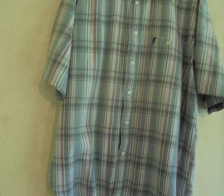 Chemise manches courtes, de la marque originale Gentleman Farmer, à carreaux, dans les tons de dégradé de gris rehaussé de rayures orangées, col boutonné, boutons imitation na