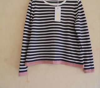 Très joli pull fin, de la marque originale Only, très belle maille douce et légèrement extensible, très agréable à porter, en 100 % polyamide, à rayures marine, longueur : 55