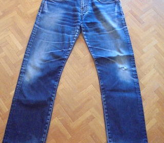 Jean de couleur bleu, de la marque originale Kiliwatch, style légèrement délavé et troué, 3 poches devant, 2 poches derrière, fermeture par fermeture éclair + bouton, longueu