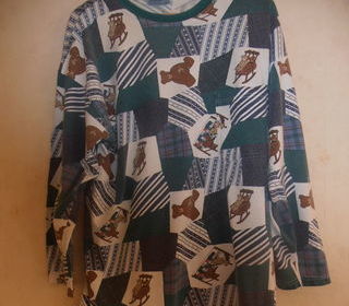 Pyjama court, de la marque originale Etam, composé d'un haut, col rond, poche poitrine, manches longues, à rayures bleues et blanches, motifs oursons sur fond vert et bleu,