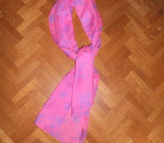 Très jolie écharpe, en voile, fond rose, agrémentée de motifs papillons mauves, dimensions : 144 cm x 30 cm. Excellent état. A récupérer sur place ou possibilité d'envoi