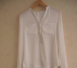 Très joli chemisier, de la marque originale Promod, de couleur blanche, col en "V", agrémenté d'une bordure dorée, manches longues fermées par un bouton, 2 poches poitrine,