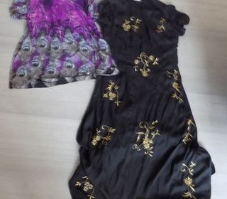 Lot de 5 vêtements comprenant une belle robe mi-longue, un haut léger violet et noir, un haut noir, un pull col roulé chaud et une jupe rose clair
