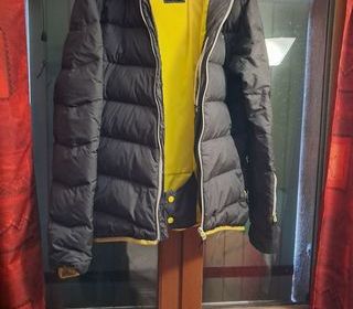 anorak noir et jaune, stylé Décathlon. Couleurs jaune et noire .Chaud et imperméable. Il accompagnera bien vous vacances à la neige.