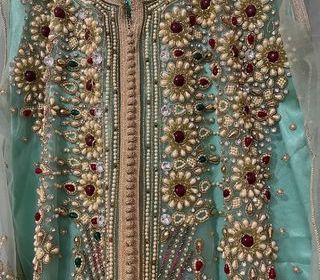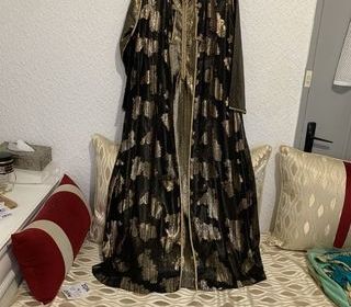 Taille XL / L Occasion très bon état 1 **Caftan long en Sarri richement brodé. 2** jupes dorées 3** Vestes courte assorti