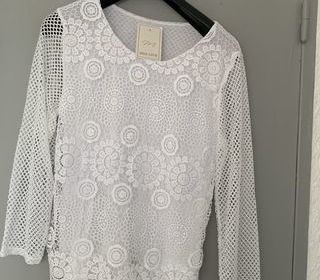 Joli haut blanc Marque Miss azur Fabriqué en Italie Face avant en dentelle fleurie Dos et manches en résine