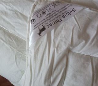 Housse de couette blanche avec étiquette de soin visible. L'étiquette présente des symboles de lavage et d'entretien. État peu utilisé et propre. 200X200
