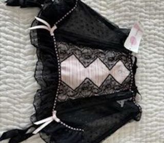 Superbe guêpière Lejaby 95B porte jarretelles brodée et dentelle bas ruban satin rose avec 2 noeuds au centre, strass au centre, incrustations dentelle sur le devant, petits pliss