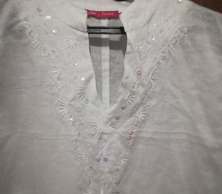Tunique blanche avec motifs en perles sur le devant Taille unique Marque Chic et Jeune 100% pur LIN Neuve à été porté une seule fois